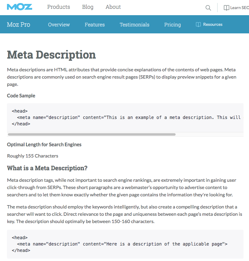 Moz’s meta description page, which has backlinks from 244 RDs, is a solid example of an authoritative yet simple answer to a “what is?” query.